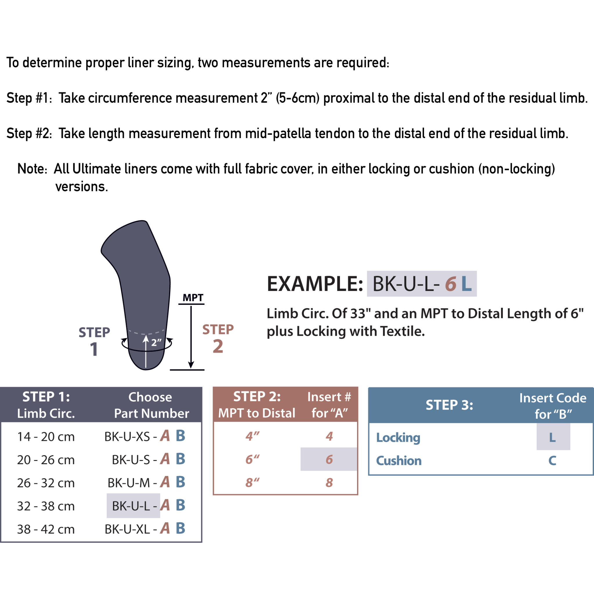 For optimal fit, take circumference measurement 5–6 cm (2") proximal to distal end of residual limb