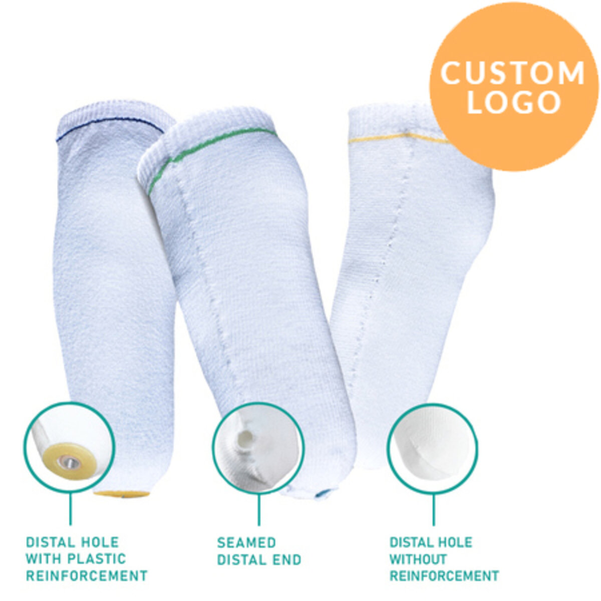 - Socks with distal hole are available with or without plastic reinforcement