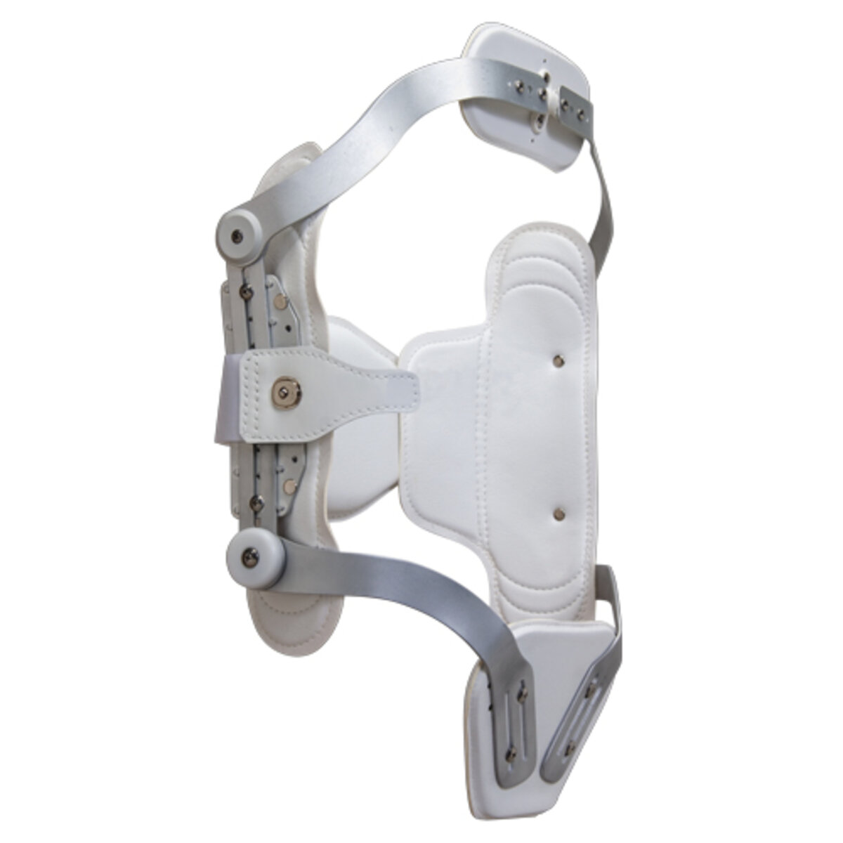 The Hyperextension TLSO consists of an anterior thoracic and pelvic assembly attached to serrated discs on the superior and interior margins of the lateral uprights. The lateral uprights are padded and adjustable in length. A posterior thoracolumbar pad is attached to the lateral upright by the Quick Release or Dot Fastener closure system. The complete kit includes a swivel sternal pad, articulating pelvic section and suprapubic pad.